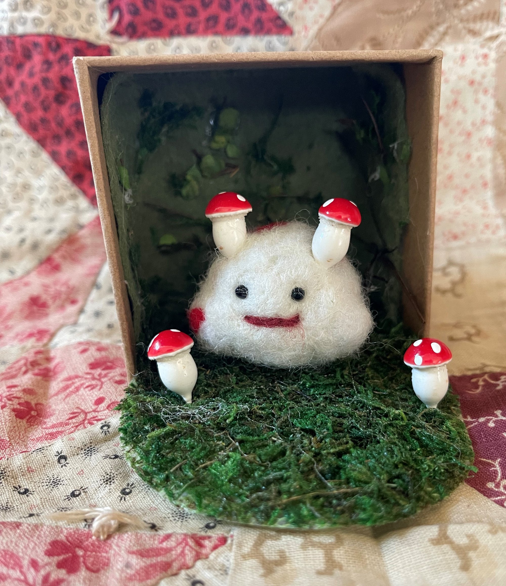 materials used to create gordon: polyfil interior, wool exterior, synthetic mushrooms